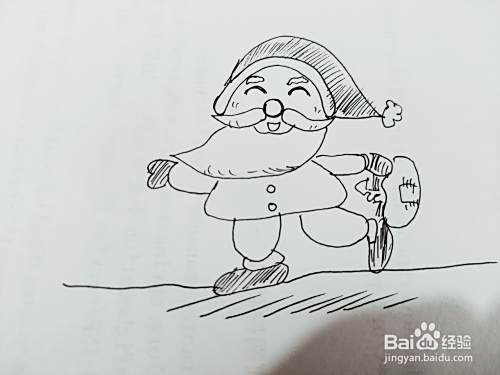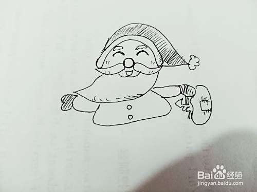 第六步,我们来画圣诞老人的身体轮廓,以及手中拿着的圣诞袜,如下图
