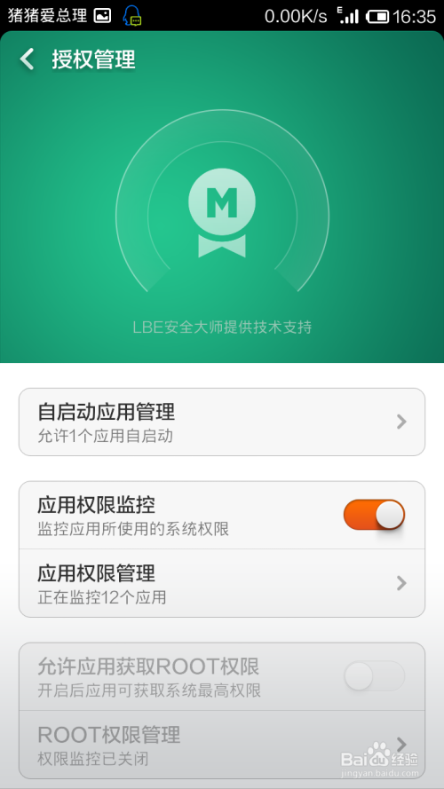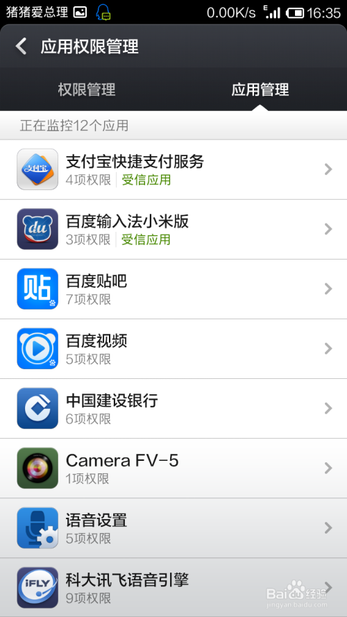 退出上个 界面,进入 第二个选项,点击 应用权限管理,然后左滑 屏幕,进入下面的界面。
