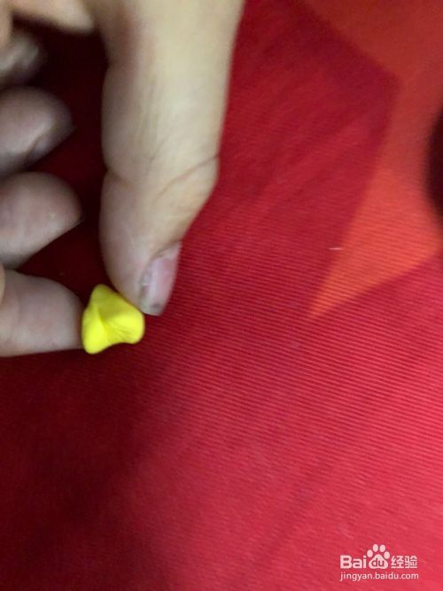 在拿出黄色的彩泥揉成V形,倒过来粘到眼睛下面做嘴巴,在拿出黑色的彩泥揉成两个弯弯的小长条粘到两边,