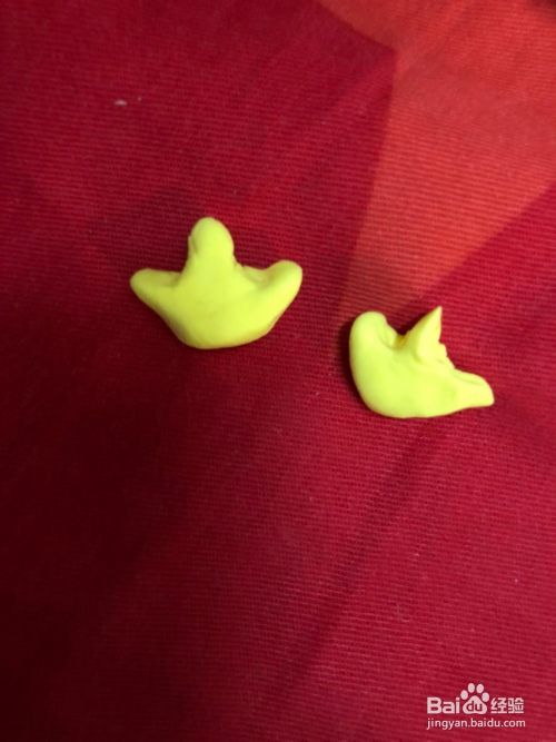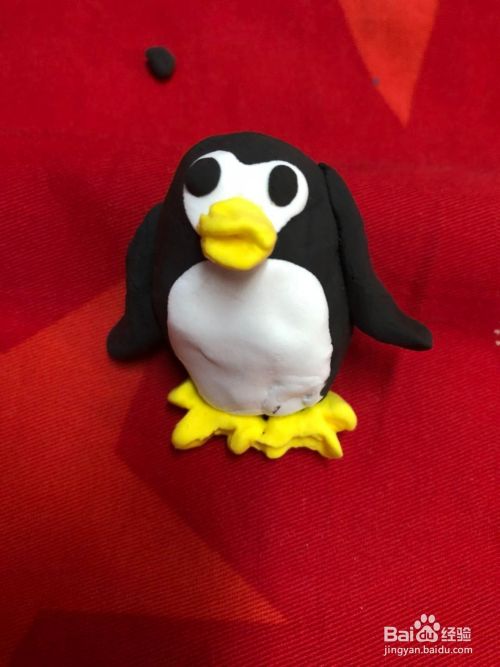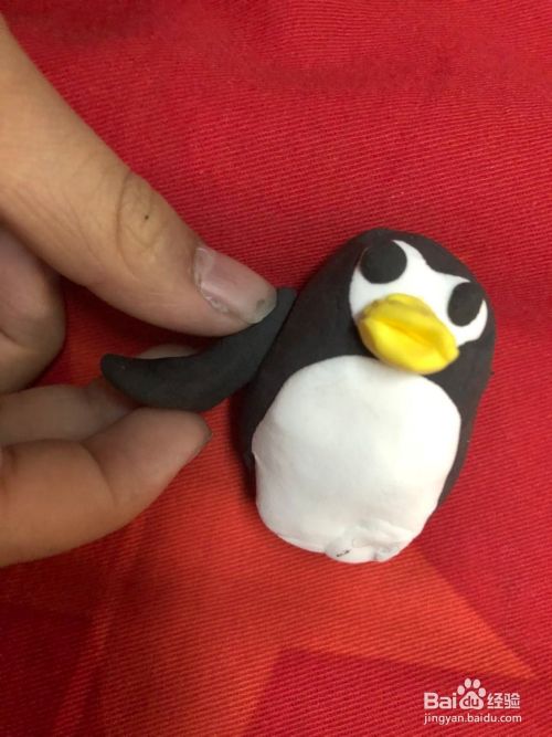 在拿出黄色的彩泥揉成W形两个粘到企鹅的下面。