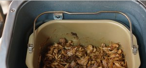 放入面包机,把调料全部放入,盖上盖子,按到肉松模式。一个程序后感觉不够干可以再启动个程序,多工作20分钟就可以倒出了