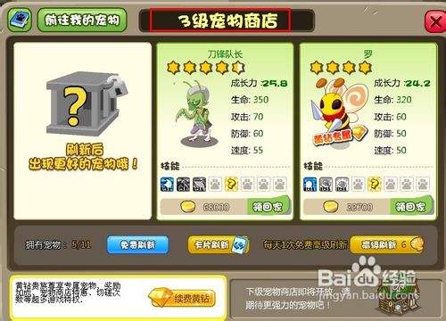 另外我们需要高等级的宠物商店,这样才能刷新出高成长力的宠物。升级宠物商店方法,需要参加竞技场PK。获得宠物威望、现在最高等级三级商店。需要60万的宠物威望。另外如果开通了黄钻我们可以进入QQ空间或者校友登录游戏, 就有可能刷新出来黄钻专属宠物小黄蜂和二鸭少爷!蓝钻和会员可以刷新出布鲁斯和QQ红毛。蓝钻的可能是要在QQ游戏客户端登录。会员的我自己也不大清楚。