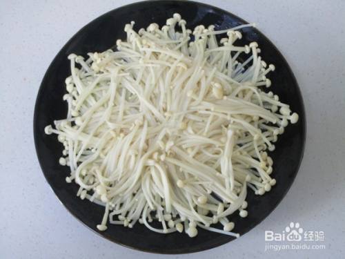 锅内水开后,把金针菇加入烫约一分钟后捞起,装入盘子里。