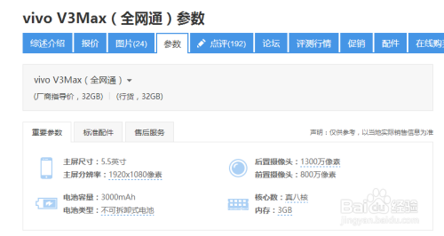 在配置方面,vivo V3 Max A是一款4G全网通手机,拥有5.5寸1080P屏幕,1.5GHz八核处理器(不知是骁龙还是联发科),内置3GB+32GB内存,双摄像头(规格未知,估计主相机1300万),运行基于Android5.1定制的系统,电池容量3000毫安时。