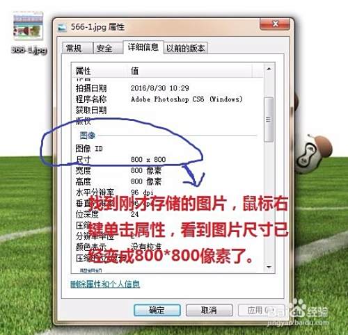 找到存储的图片,鼠标右键单击属性,在详细信息内,我们看到图片的尺寸已经变成我们想要的800*800像素。完成!