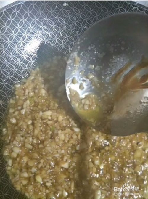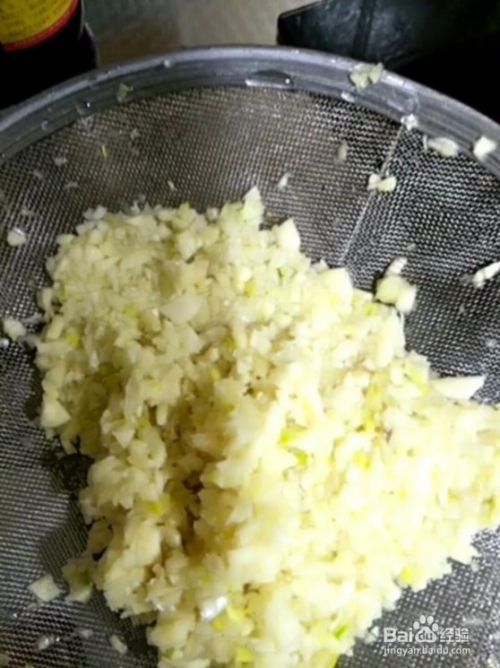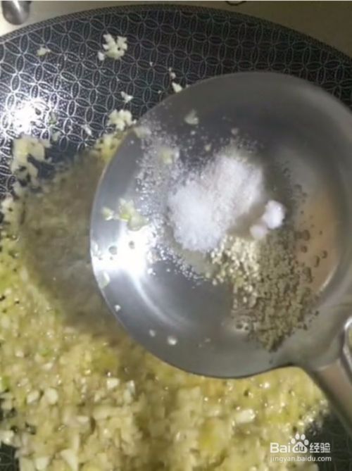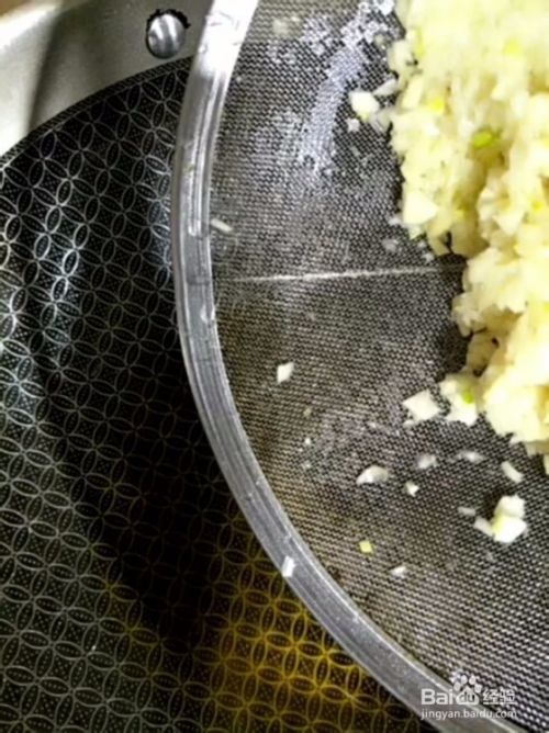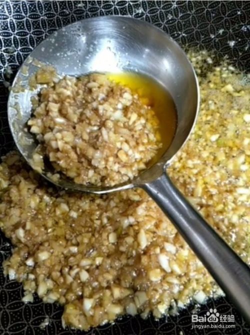 2、把大蒜切成末,用水清洗干净,起锅烧油放入大蒜炸制加盐、鸡精、白糖。