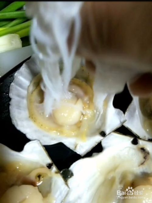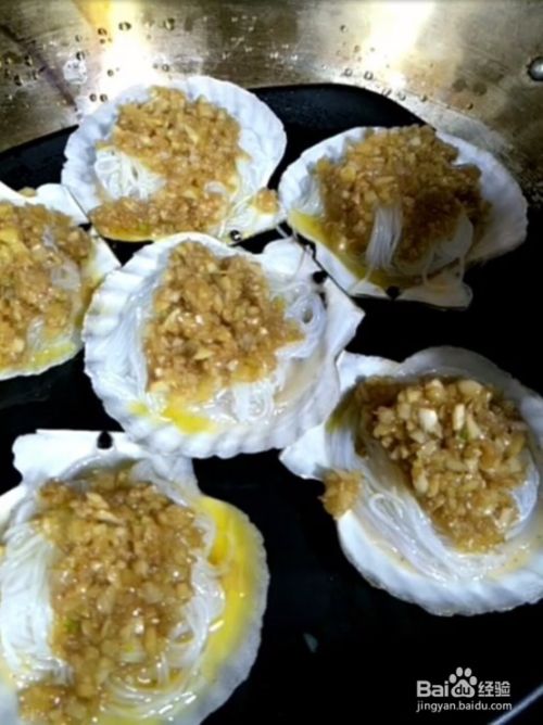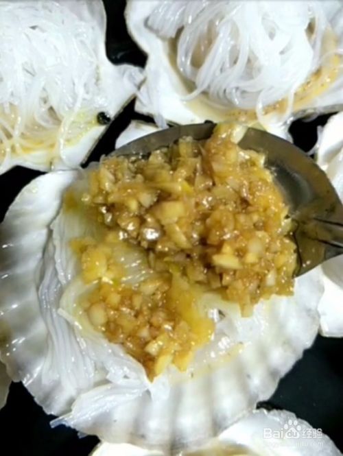 4、扇贝上放准备好的粉丝撒上准备好的蒜蓉,香葱、红辣椒切小断备用。