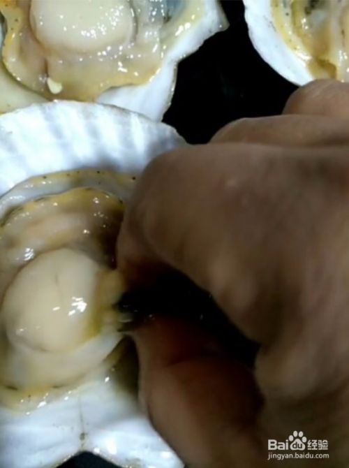 1、把扇贝清洗干净,用刀劈开去除沙袋。清洗干净,在扇贝上打上花刀。