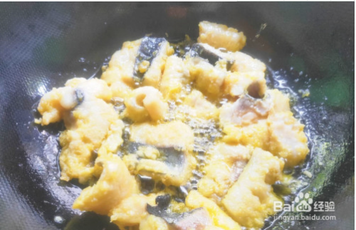 锅里倒入适量菜籽油,将裹上蛋糊的把鱼块放入锅中,炸制定型,两面金黄后,捞出,备用。