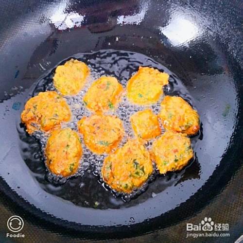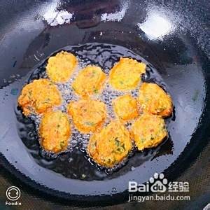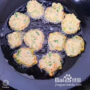 起锅,多放点油,用手挤出丸子大小,下锅炸,不要太大火,一面煎熟再翻面!