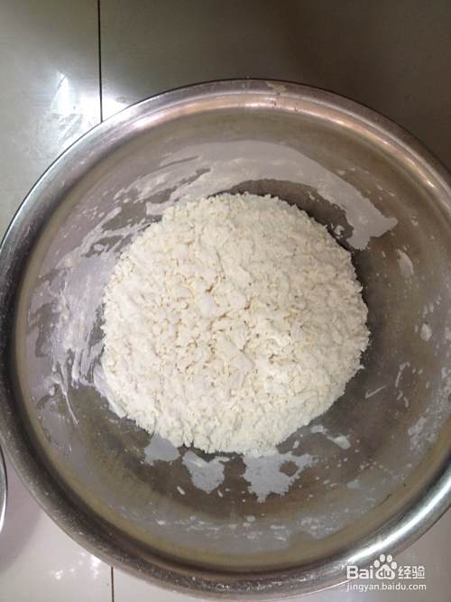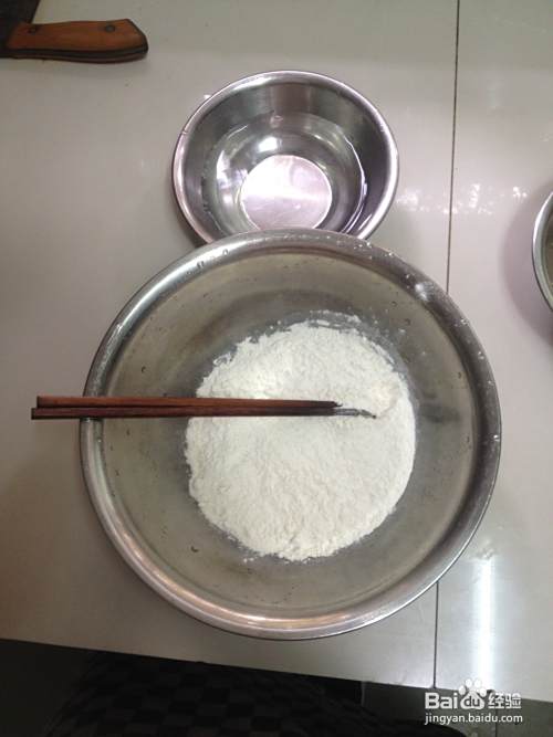 接下来就要制作拌汤必备的面疙瘩了,取一盆加入少许面粉、大约半碗,准备一碗水,一边用筷子搅拌面粉,一边往盆里面加水,倒水的时候一定要慢慢倒,就像倒酒似的,让水拉着细细的一条线流入盆中,另一只手用筷子不停的搅拌,防止面粉见水太多全部凝结成一块。待大部分面粉变成小疙瘩后就好了。