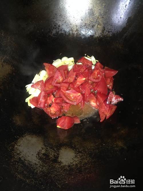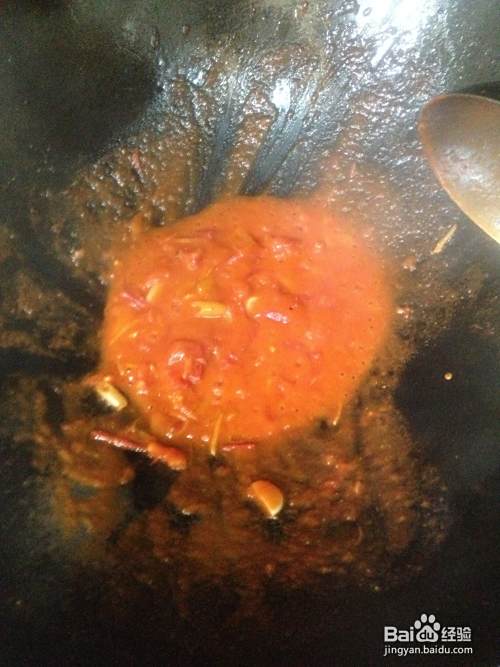 此时加入西红柿,然后加少许盐大火翻炒,直到西红柿全部炒的如浆糊状即可,