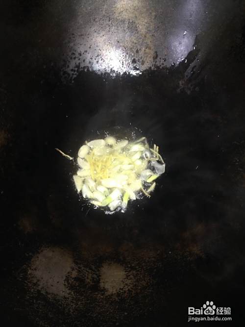 起锅,加少半勺油,待油温轻微冒烟后,加入前面备好的葱姜蒜, 葱姜蒜炒至金黄 即可。