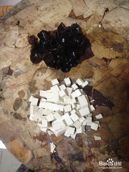 香菇,豆腐切丁,木耳改刀 。