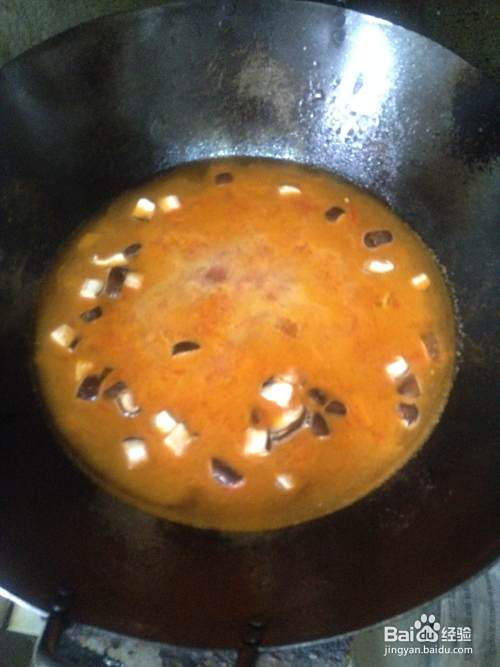 锅里加水,豆腐,香菇,大火烧开。加入盐,味精,鸡精,十三香,鸡汁,尝尝咸淡。