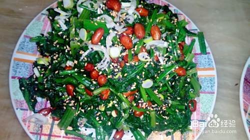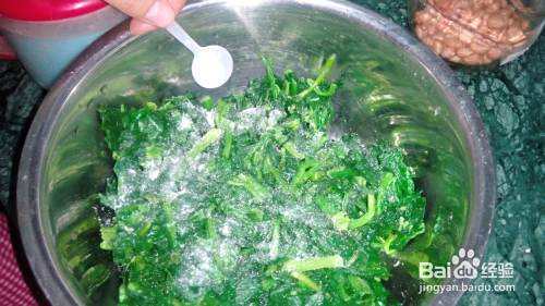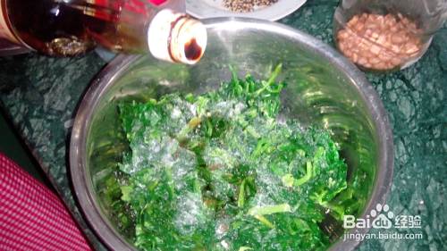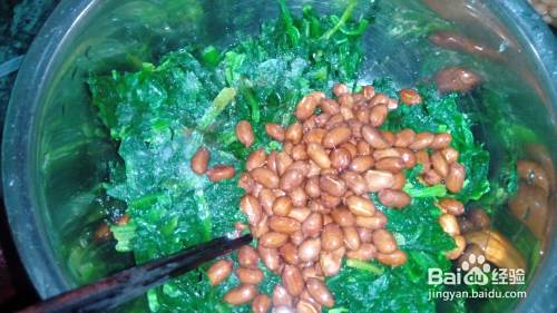 在菠菜盆中放入适量盐,生抽酱油,少量糖、香醋、葱花、芝麻等,再把锅中放凉的花生米倒入盆中。