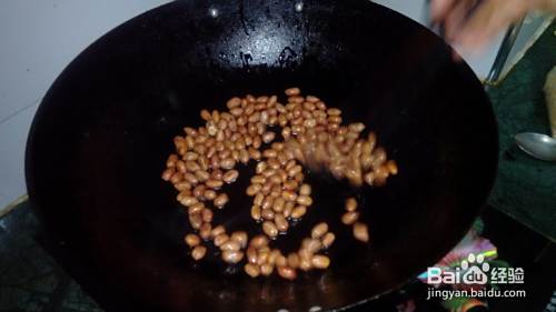 锅中入少量油,油七成热时,放入花生米。小火,用筷子不断搅拌,片刻功夫,听到一阵响声,花生皮变红,花生碰撞锅时发出的声音较清脆,关火。