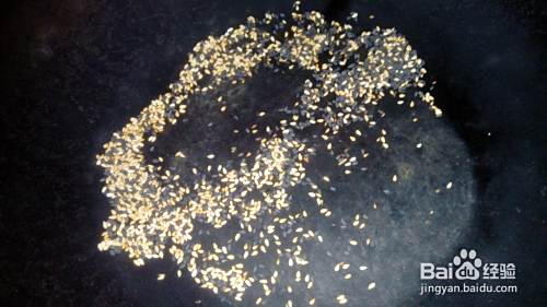 锅烧干,放入黑白芝麻。当听到噼里啪啦的声音时,芝麻炒熟,出锅。