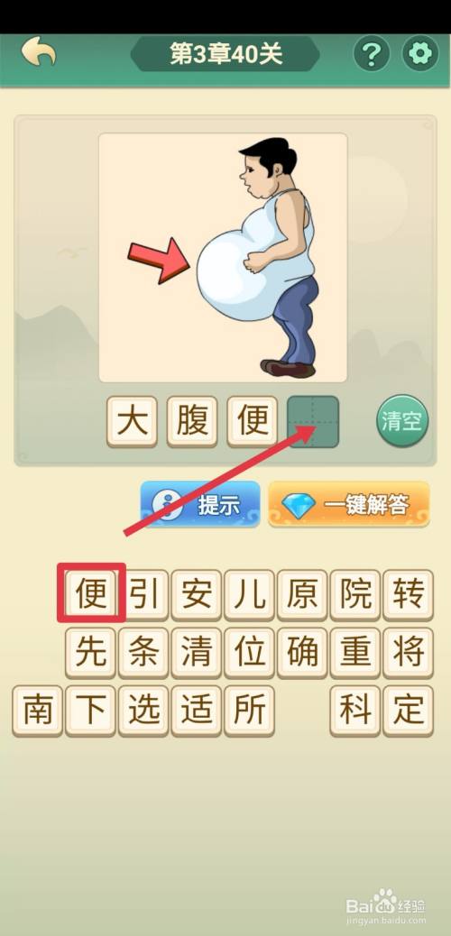 第3章第40关,图中有个男人,很肥胖,肚子特别大,所以本关成语为大腹便便,出自宋·李昉《太平广记》卷二四五引《后颜录·边韶》;