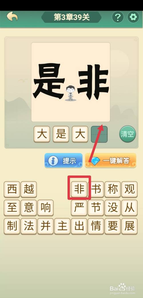第3章第39关,图中有是、非两字,比人大了很多,所以本关成语为大是大非,出自徐迟《歌德巴赫猜想》;