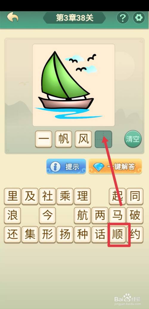 第3章第38关,图中有一艘船,在风平浪静的湖面上,所以本关答案为风平浪静,出自宋·陆九渊《语录》;