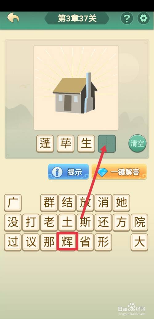 第3章第37关,图中有个简陋的房子,房顶四周散发着光辉,所以本关成语为蓬荜生辉,出自宋·王柏《回赵星诸书》;
