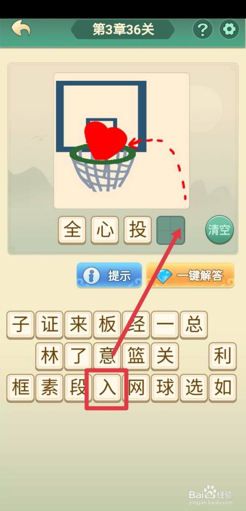 第3章第36关,图中有一颗红心整个都投入了篮球框中,所以本关成语为全心投入;