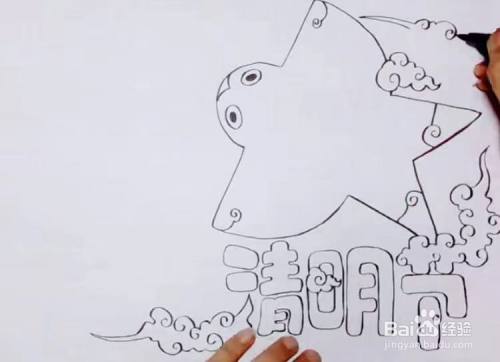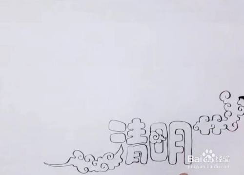 先写上主题词“清明节”这三个空心字,再画出一些祥云图案做装饰