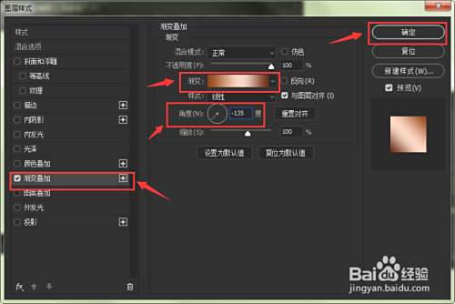 在渐变叠加里面,设置自己喜欢的渐变颜色,角度为【-135】度,点击【确