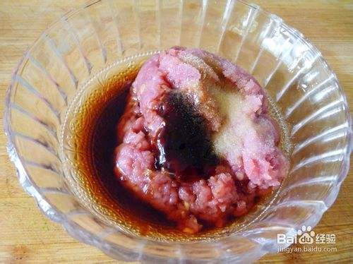 7肉馅中放入绍酒、生抽、盐、蚝油、鸡精。