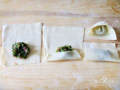 12然后把馅放在皮中下位置,这起一点,在往上折一下,然后边上抹上一点水捏严就成馄饨了。如果是纯肉的也不用沾水。