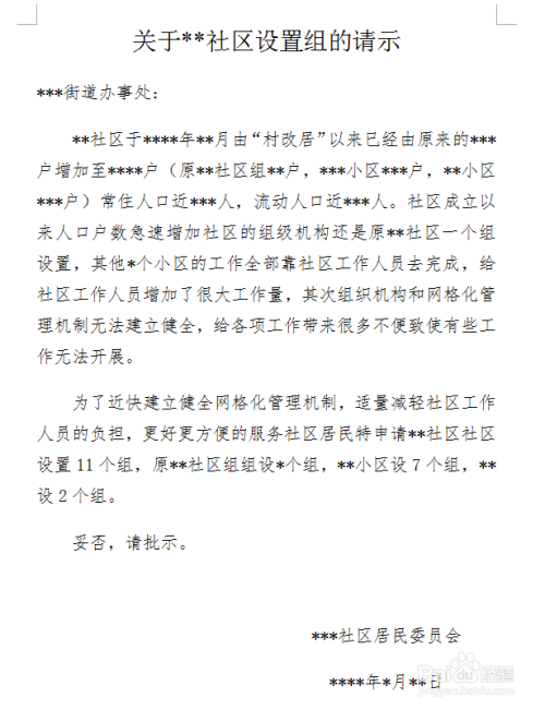 关于**社区设置组的请示一般由社区向街道办打请示报告,要求增加社区内的居民小组数量。内容包含:标题、申请单位、社区简介、申请内容、请示标准内容、落款。