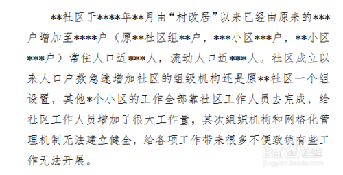 社区简介。要求将社区目前实际情况写清楚,比如是老旧社区新增小区,或者“村改居”扩大了范围等。一般情况500人口为一个居民小组数量。字体:仿宋,三号。