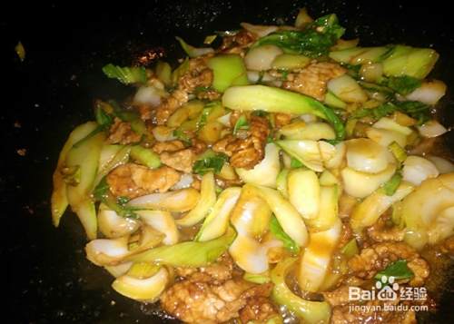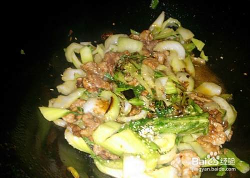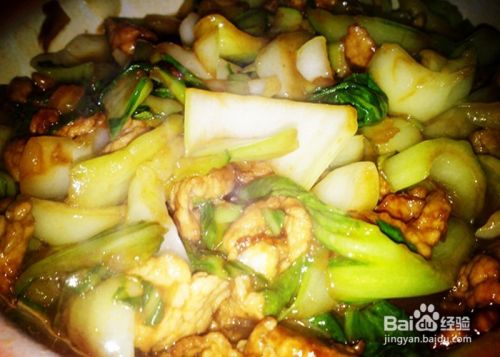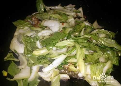 最后猪肉与油菜同炒到入味、变色、油菜显熟,这道家常菜就可以出锅了哦。