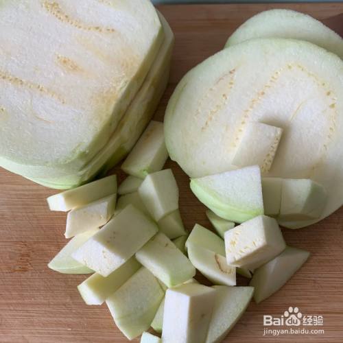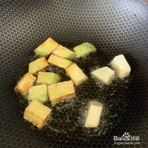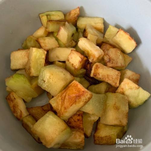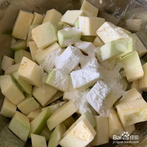 裹上一层玉米淀粉,薄薄的一层就好了,我倒了大概三勺(切好丁的茄子洗一下留一点点水分这样比较好粘淀粉)
