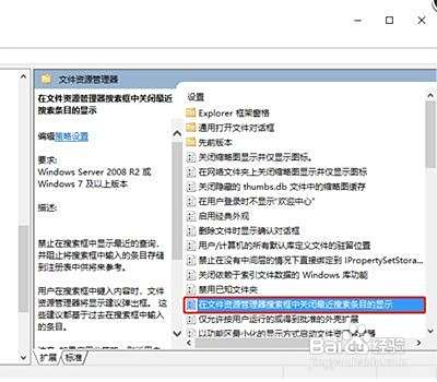 选中文件资源管理器,在右边窗口找到并双击在文件资源管理器搜索框中关闭最近搜索条目的显示策略进入。