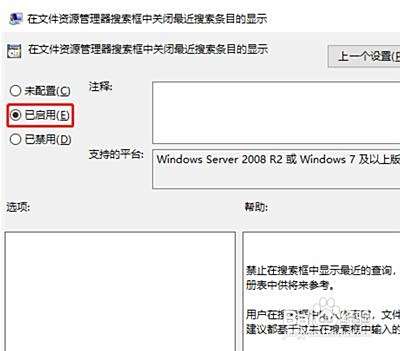 在弹出的在文件资源管理器搜索框中关闭最近搜索条目的显示对话框,勾选已启用点击确定即可。