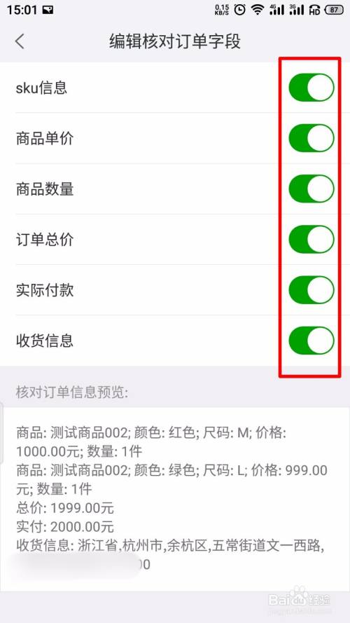 【2】点击 编辑核对订单字段,开启或关闭选项,设置完成。
