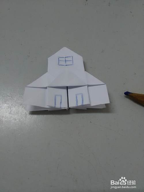 用笔在纸上画一个田字和两个长方形,表示门和窗,一座小楼房就折好了。