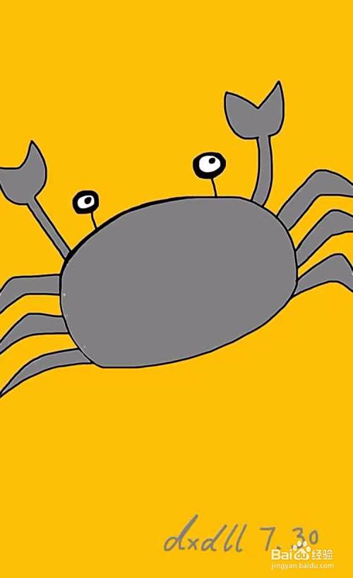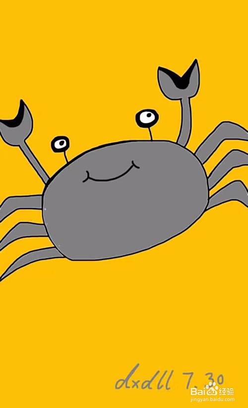 我们在用笔画出螃蟹的双钳和腿,灰色选择油漆桶工具,为螃蟹身体上色。黄色给背景图层上色。