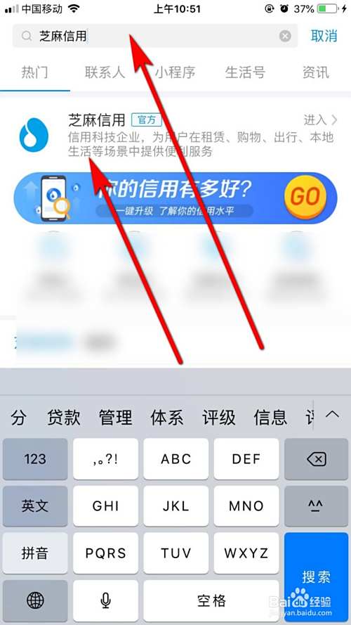 第二步,输入芝麻信用,找到并进入芝麻信用入口