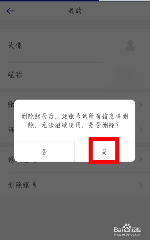 在弹出的删除账号窗口中,点击右边的是。如图所示