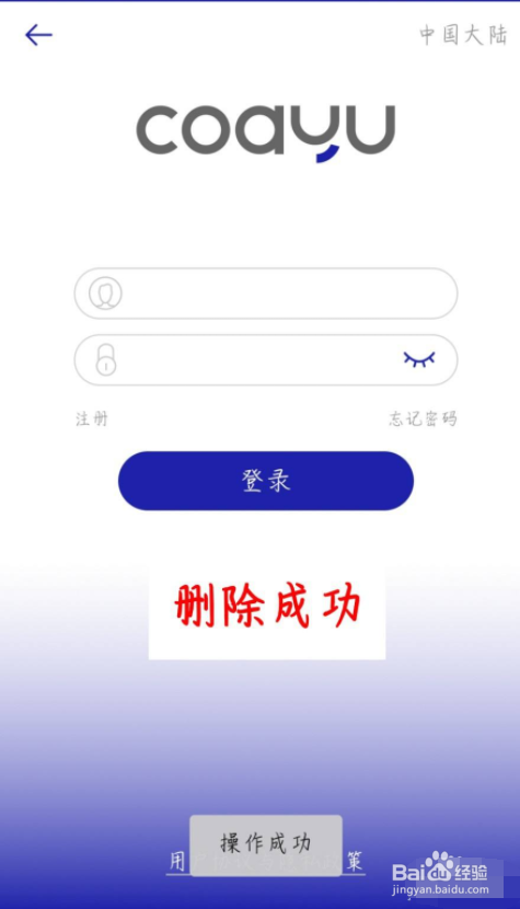 账号删除成功后,退出登录,就不能在登录账号了,需要重新注册。如图所示