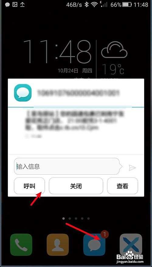 7、如果有短信信息过来,手机就会看到如下的弹框,如图。