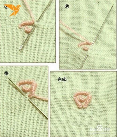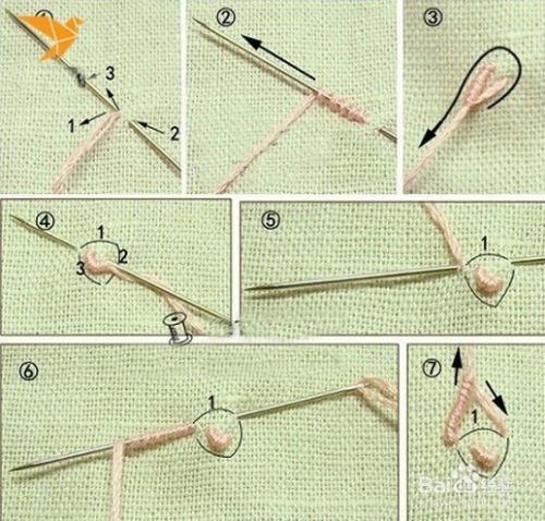 首先在十字绣的绣布上面起针之后,再绣的时候在针上缠绕之后再拉针,然后继续按照教程中的进行绕针之后拉针。要注意针的走向,让花瓣自然一些。可以换颜色进行第二圈的刺绣,然后可以换成绿色的线进行叶片的刺绣啦。