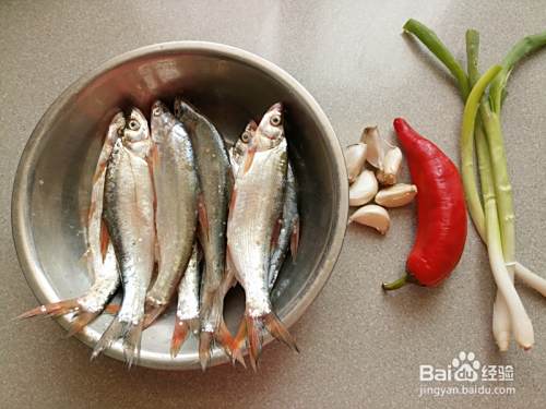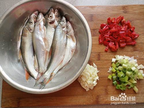 白条鱼去除鱼鳞、鱼鳃、内脏、以及黑膜洗净后控水,辣椒去籽切块、葱切段、蒜瓣去皮切碎。