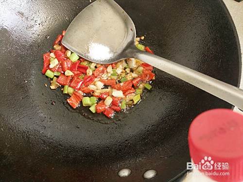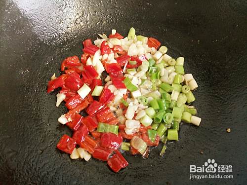 锅中留点底油,加入红辣椒、葱和蒜瓣炒出香味。
