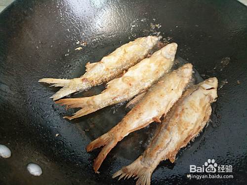 捞出鱼后,再加入油烧热,再油煎剩下的四条鱼,所有的鱼煎好后,稍稍控油后装入盘子中备用。