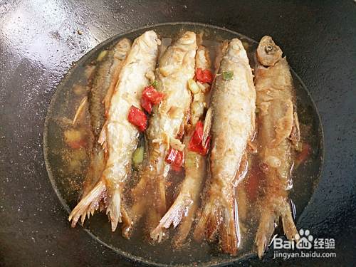 放入白条鱼,加入适量水,倒入醋和料酒到鱼身上。