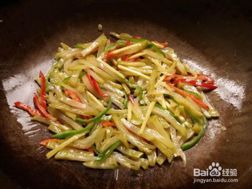 另起油锅下榨菜、青红尖椒、姜丝大火翻炒几下